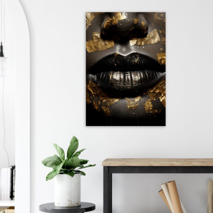 Diese Leinwand zeigt sinnliche goldene Lippen, ein Bild, das gleichzeitig Luxus und Verführung verkörpert. Das Kunstwerk ist perfekt geeignet, um einen Hauch von Glamour und Mystik in Ihre Räumlichkeiten zu bringen.