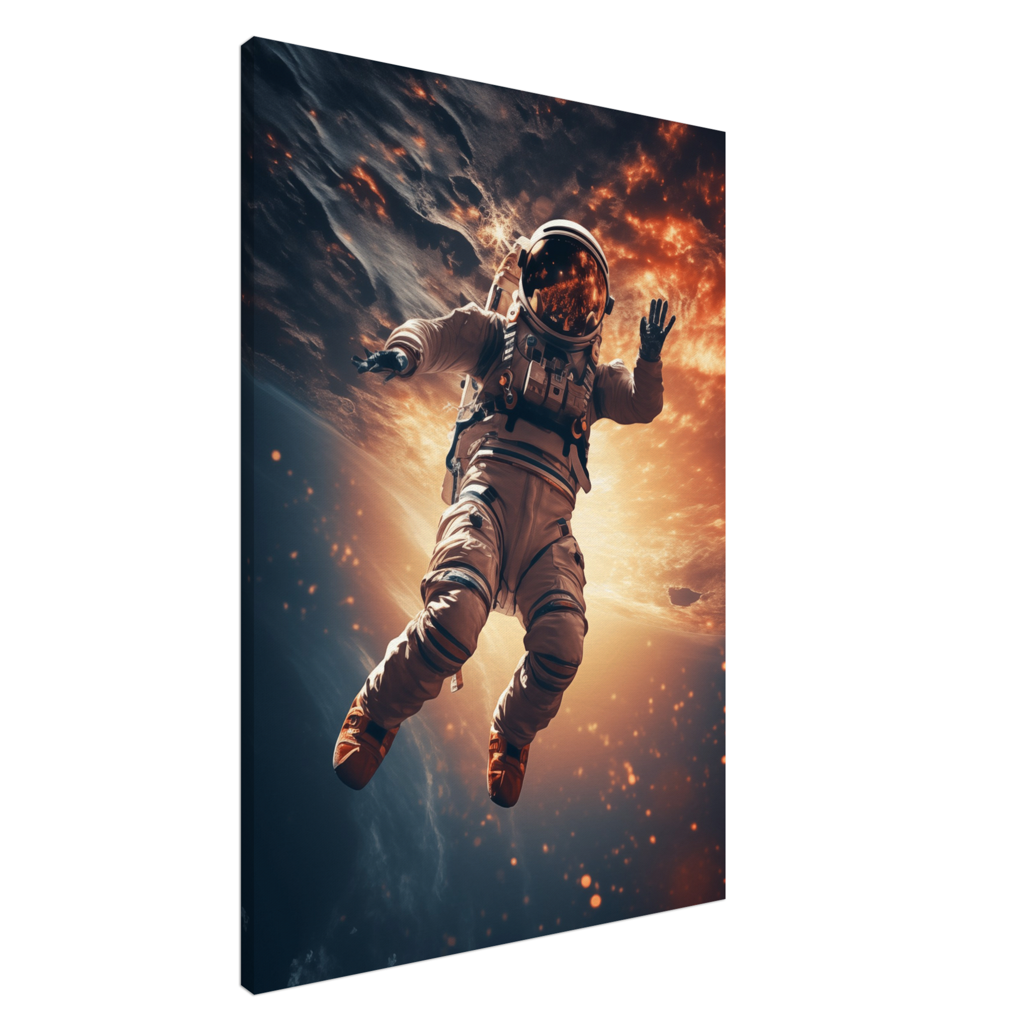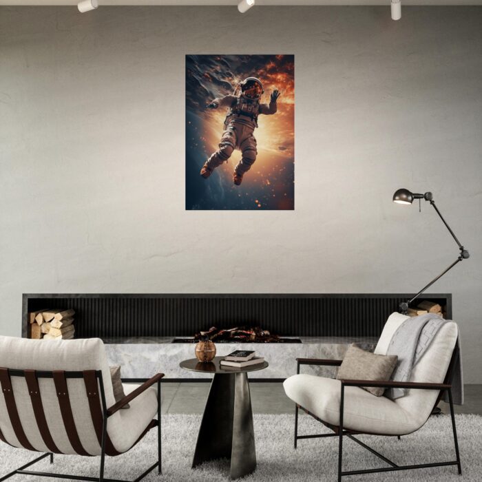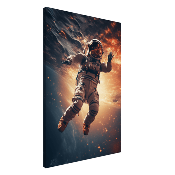 Diese Leinwand fängt die unendliche Freiheit und das Abenteuer des Weltraums ein. Ein Astronaut schwebt durch ein Sternenmeer, umgeben von den flammenden Farben ferner Galaxien und kosmischen Nebeln. Es ist eine Darstellung, die den Betrachter dazu einlädt, über die Grenzen des Möglichen hinauszudenken und die eigene Welt aus einer neuen Perspektive zu betrachten.